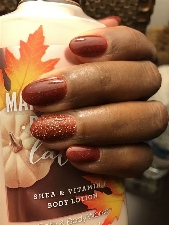Rich burgundy nails are complemented by nude accents and glitter, creating a sophisticated and balanced look.