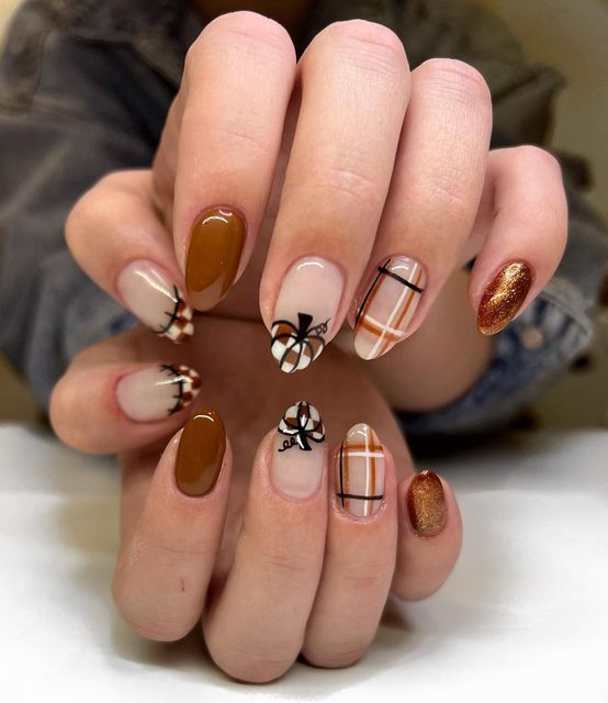 - Mix patterns and solids: Combine plaid and pumpkin motifs with solid colors to achieve a balanced and visually interesting manicure.