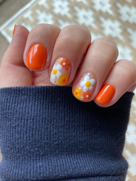 Warm orange nails paired with floral and leaf designs on a neutral base create a vibrant yet delicate look.