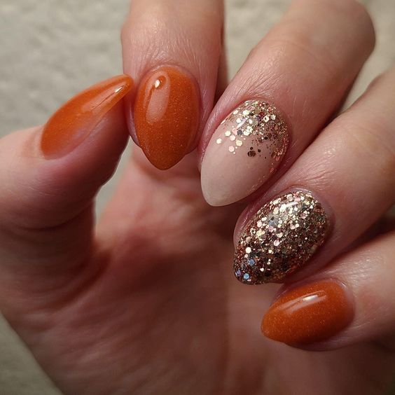 Burnt orange nails with delicate gold leaf designs paired with solid gold nails create a warm, festive look.